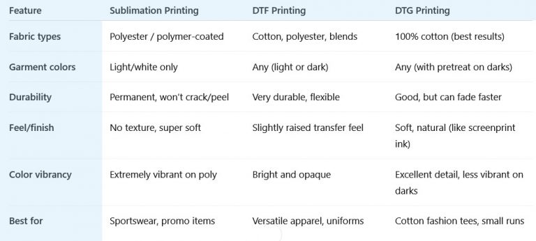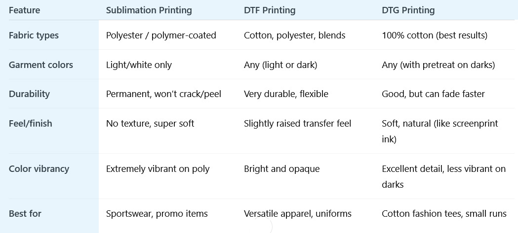 Summary: Sublimation is best for polyester and promo products, DTF is the most versatile across fabrics and colors, and DTG excels on cotton apparel where softness and detail matter.
